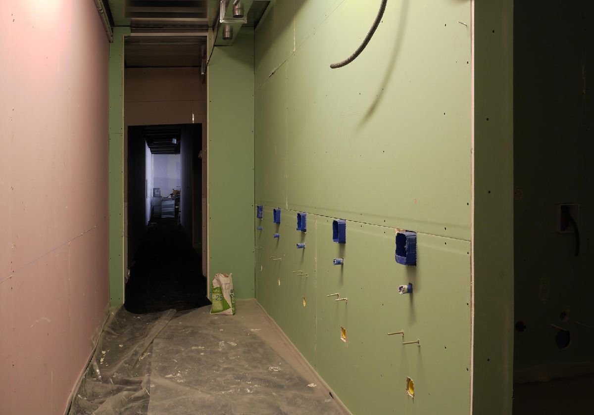 - Pareti interne EI60 con orditura metallica singola e doppio rivestimento per lato con lastre PregyPlac BA13, dimensionata per ottenere un’adeguata resistenza meccanica tenendo conto dei sovraccarichi orizzontali. Contropareti EI60 con struttura metallica e 2 PregyFlam ove richiesta la protezione al fuoco, mentre nei locali interni umidi è stata utilizzata la lastra PregYdro. Nelle vie di esodo le PregyPlac A1 BA13.